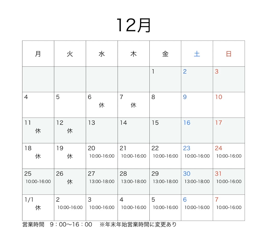 12月の営業日