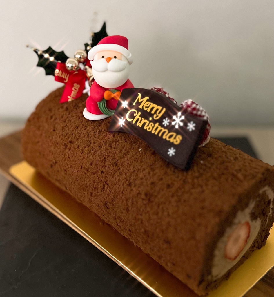ココアのふわふわスポンジをチョコクリームと苺で巻きました。