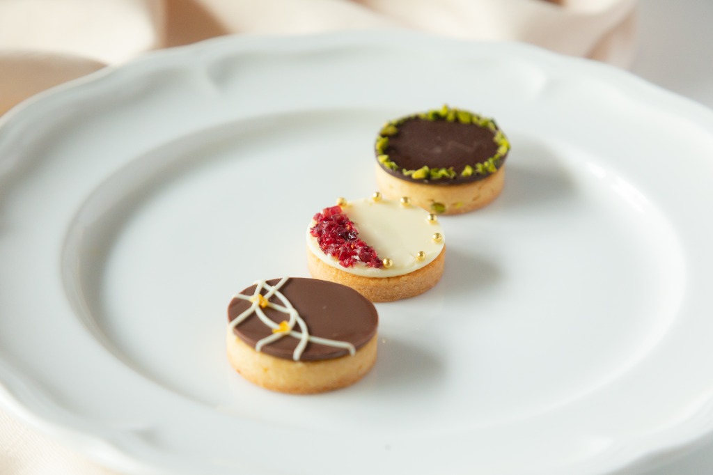 クッキー生地にピスタチオを練り込み、網目模様のスイートチョコをコーティング。
